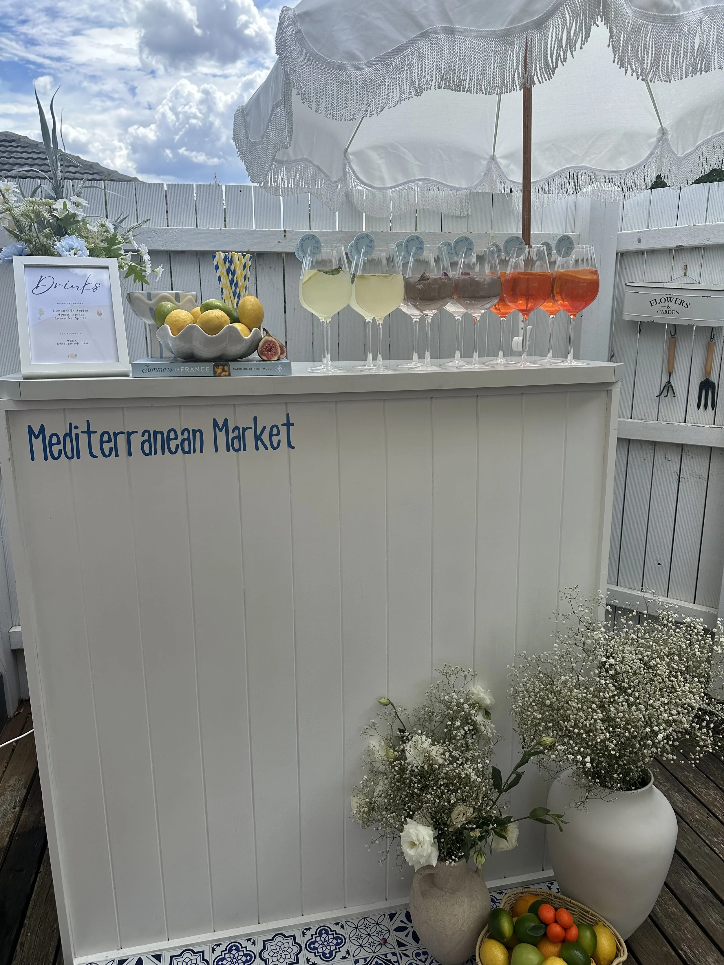 Includes flower arrangement, wine glasses, cocktail glasses, customisable vinyl sticker for the front of bar, drinks list, 1 cocktail shaker and straws